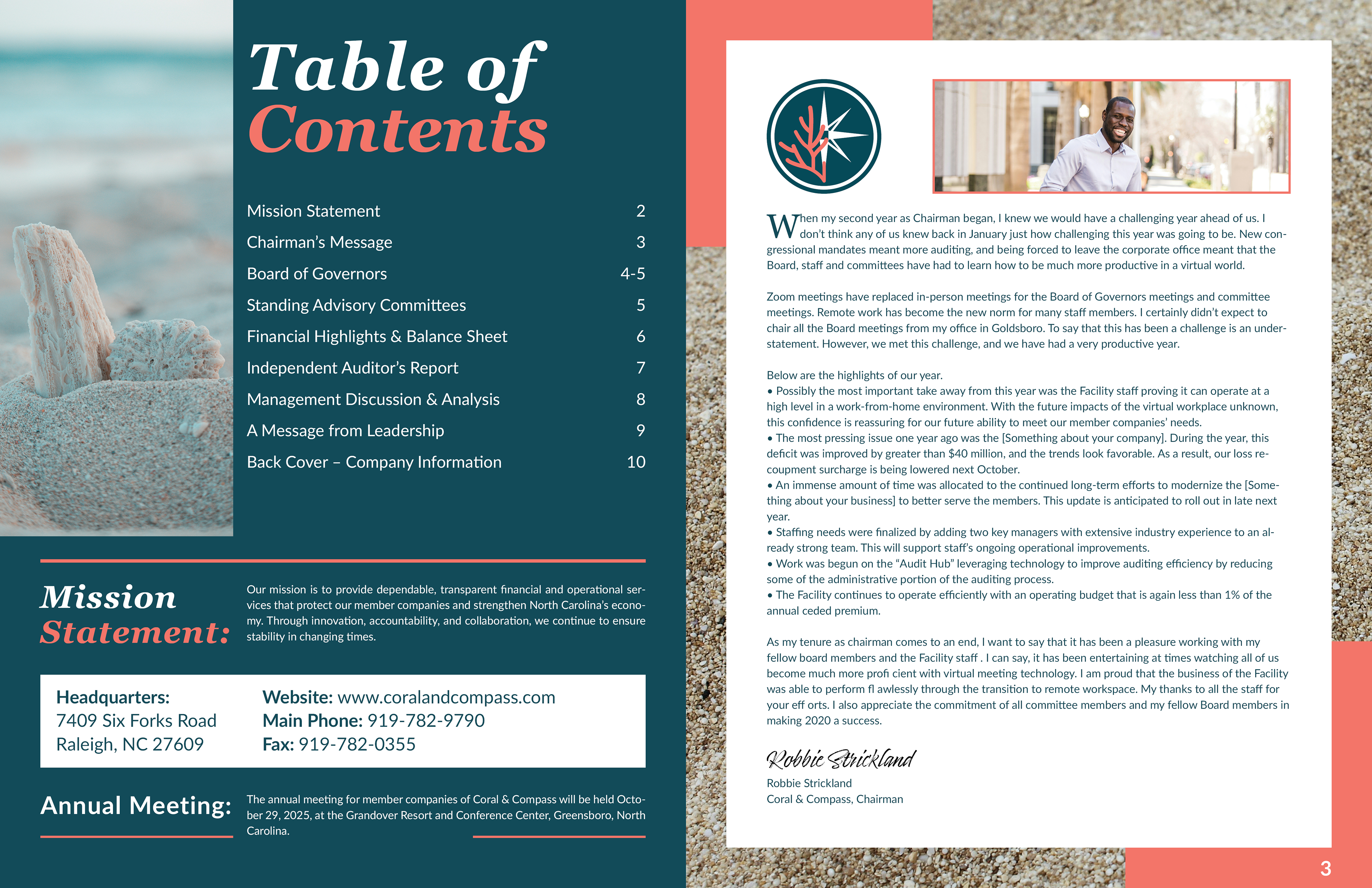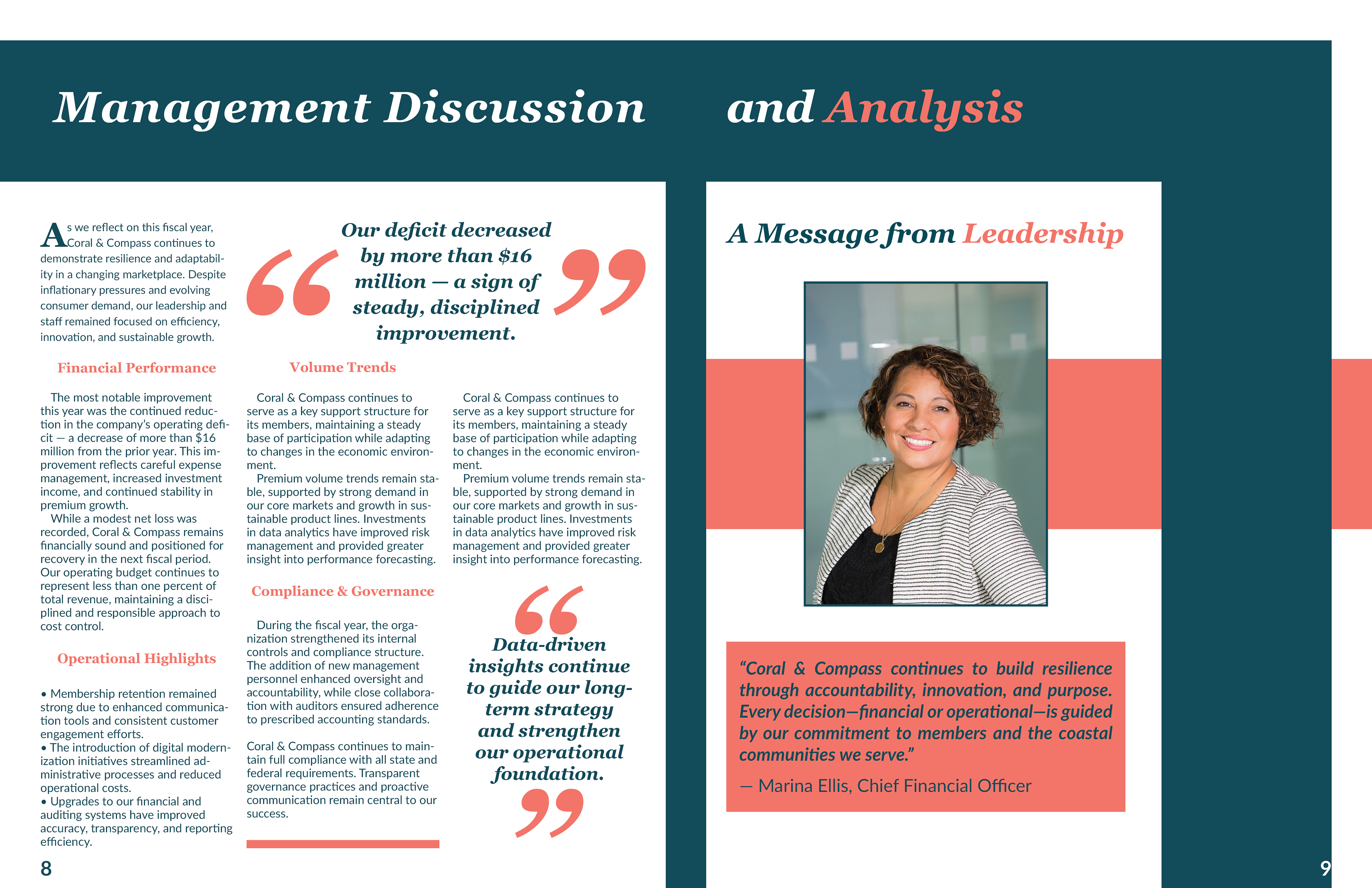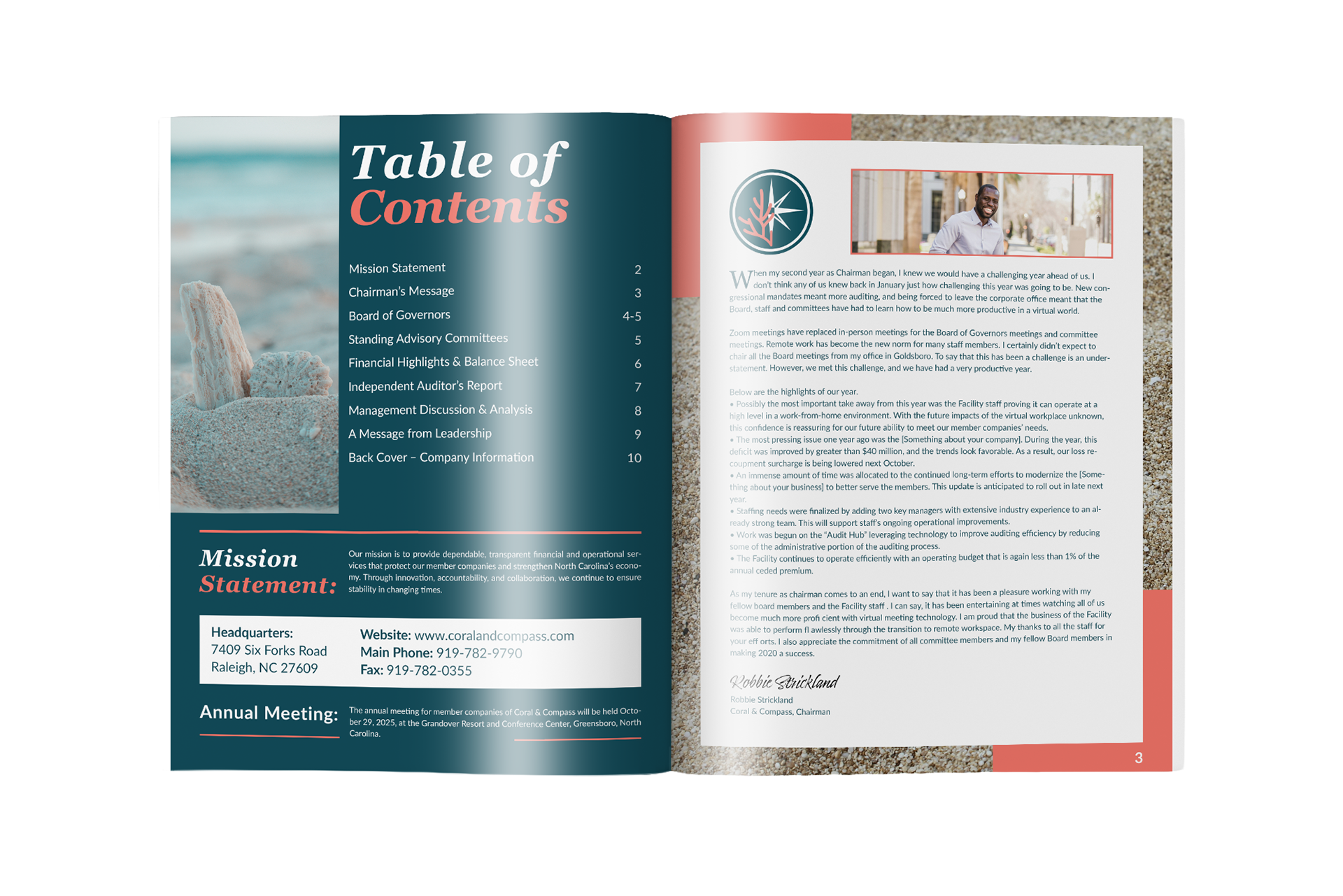 This project involved designing a multi-page annual report for Coral & Compass, focused on presenting financial and leadership information in a clear, approachable way. A restrained coastal color palette, consistent typography, and structured layouts were used to keep dense content readable while reinforcing a sense of stability and trust.