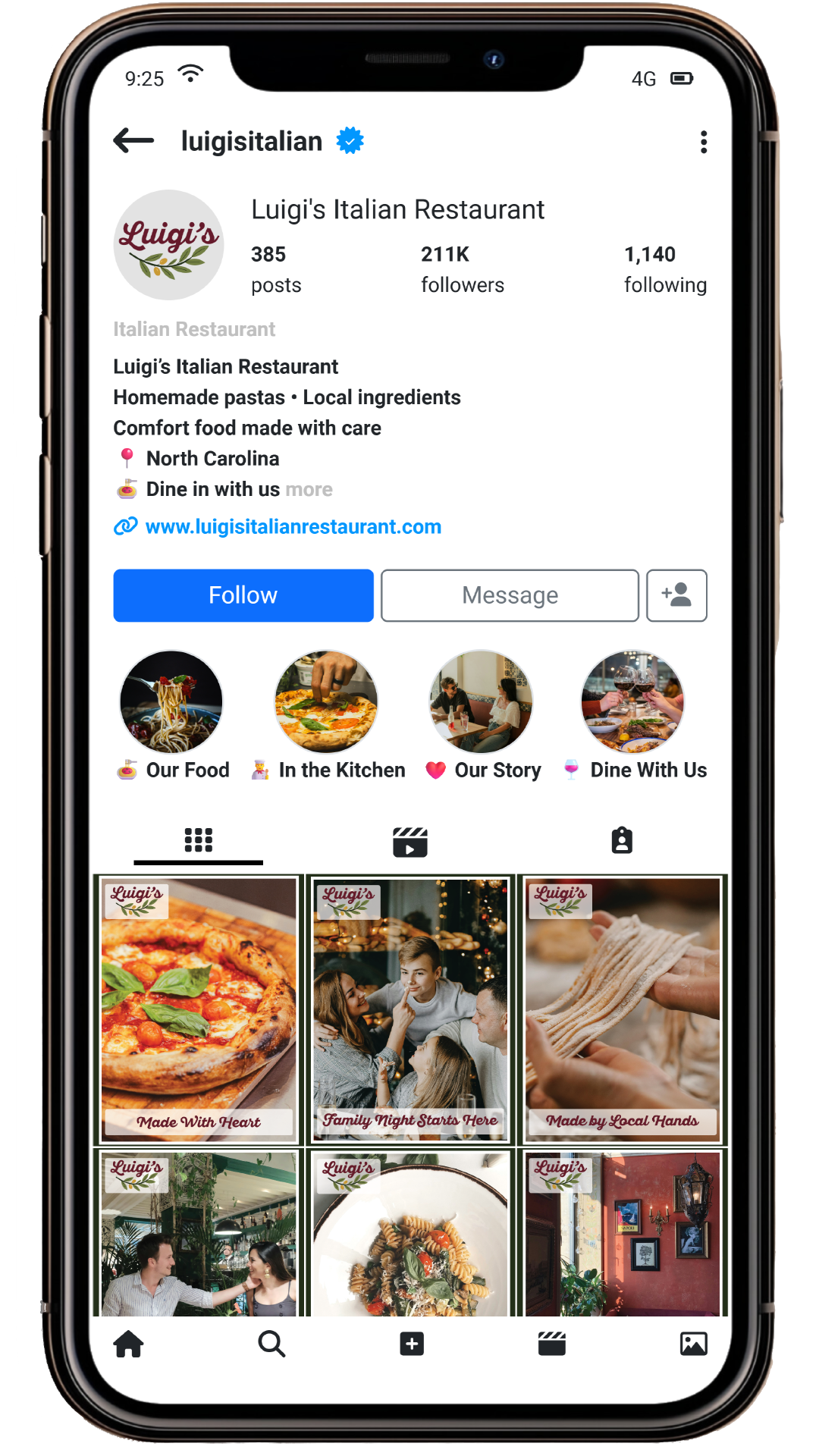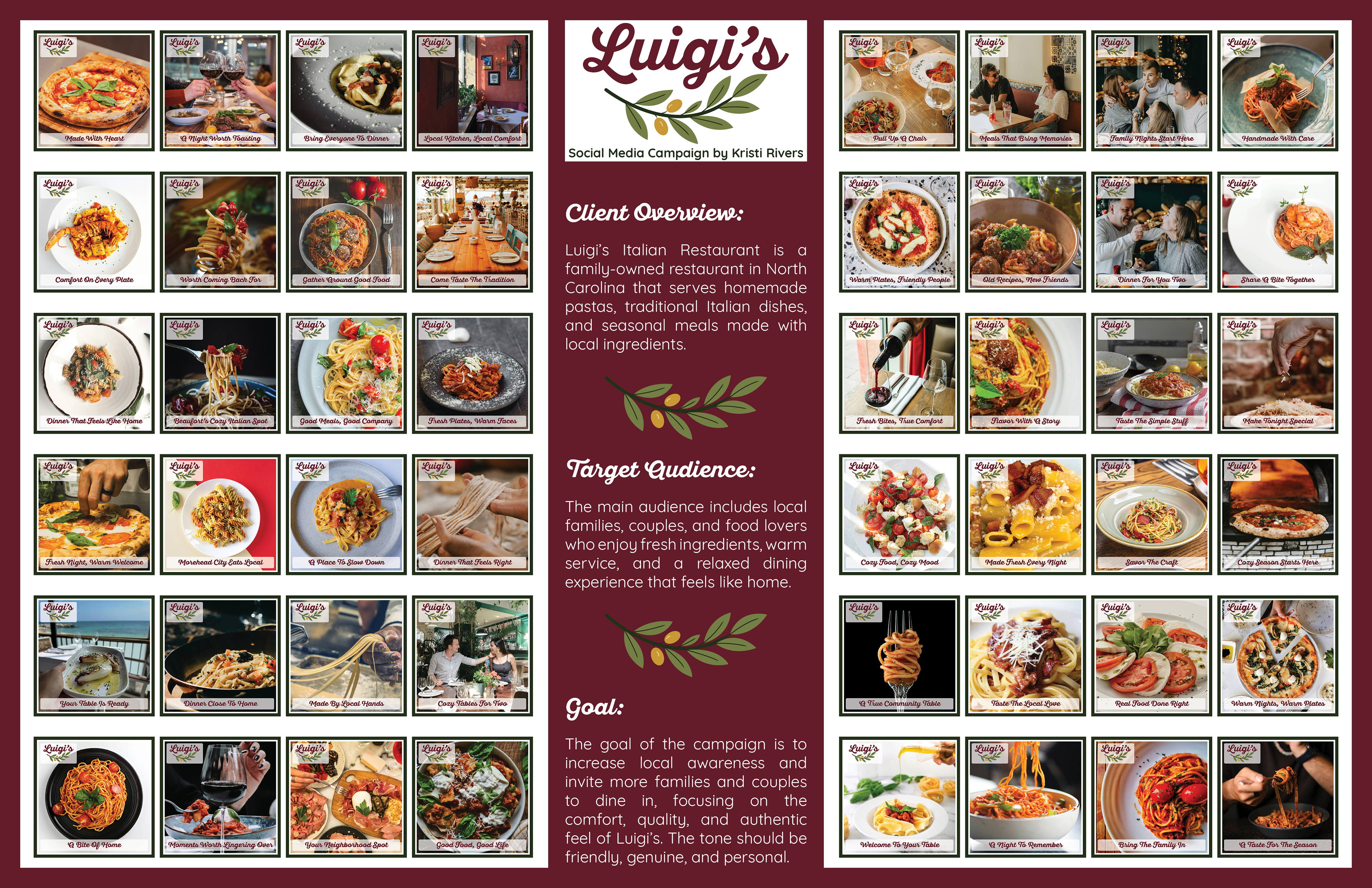 Luigi’s Italian Restaurant is a family-owned spot in North Carolina known for homemade pastas, local ingredients, and a welcoming, neighborhood feel. This social media campaign focused on translating that warmth into Instagram content that feels personal and inviting rather than promotional. The visuals highlight real dishes, shared moments, and the comfort of dining together.