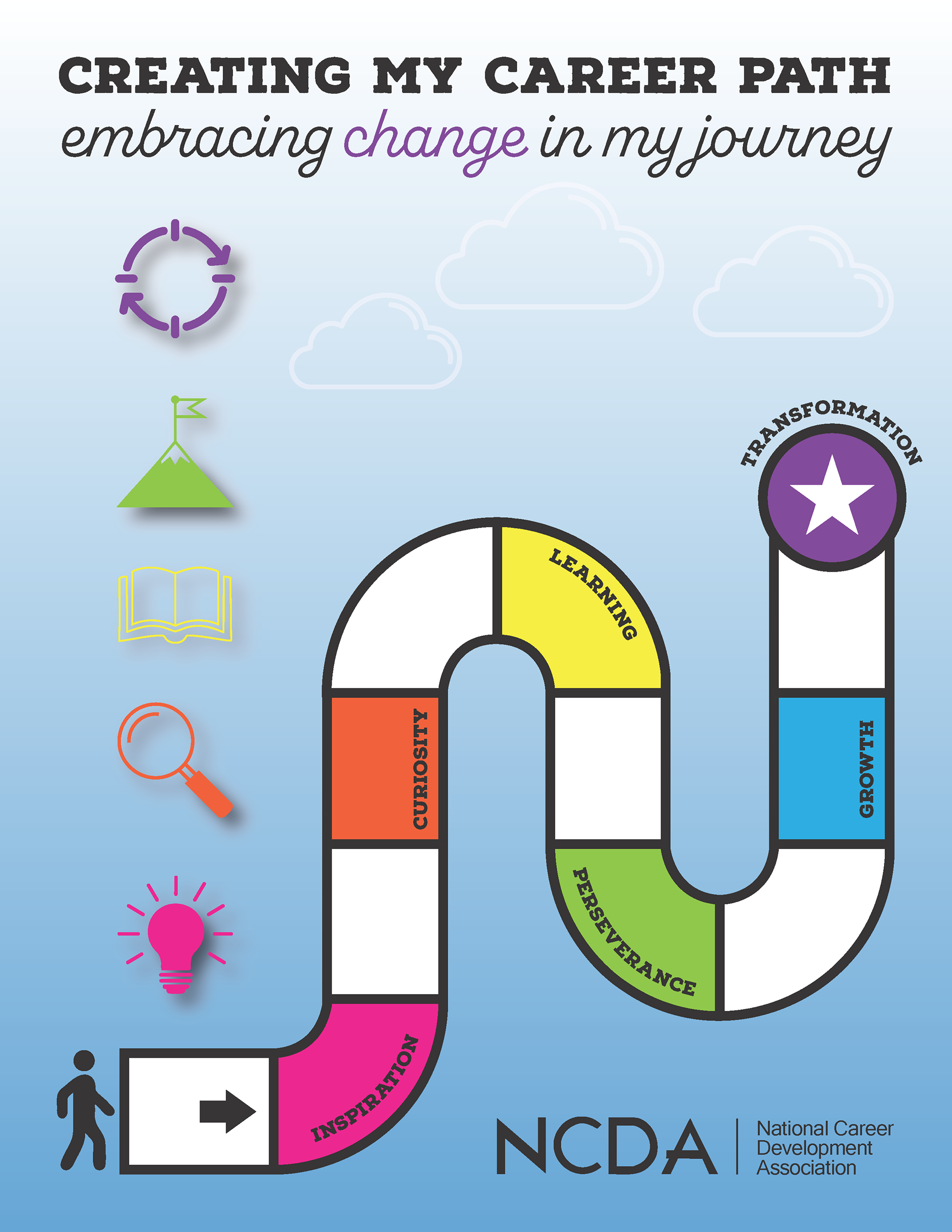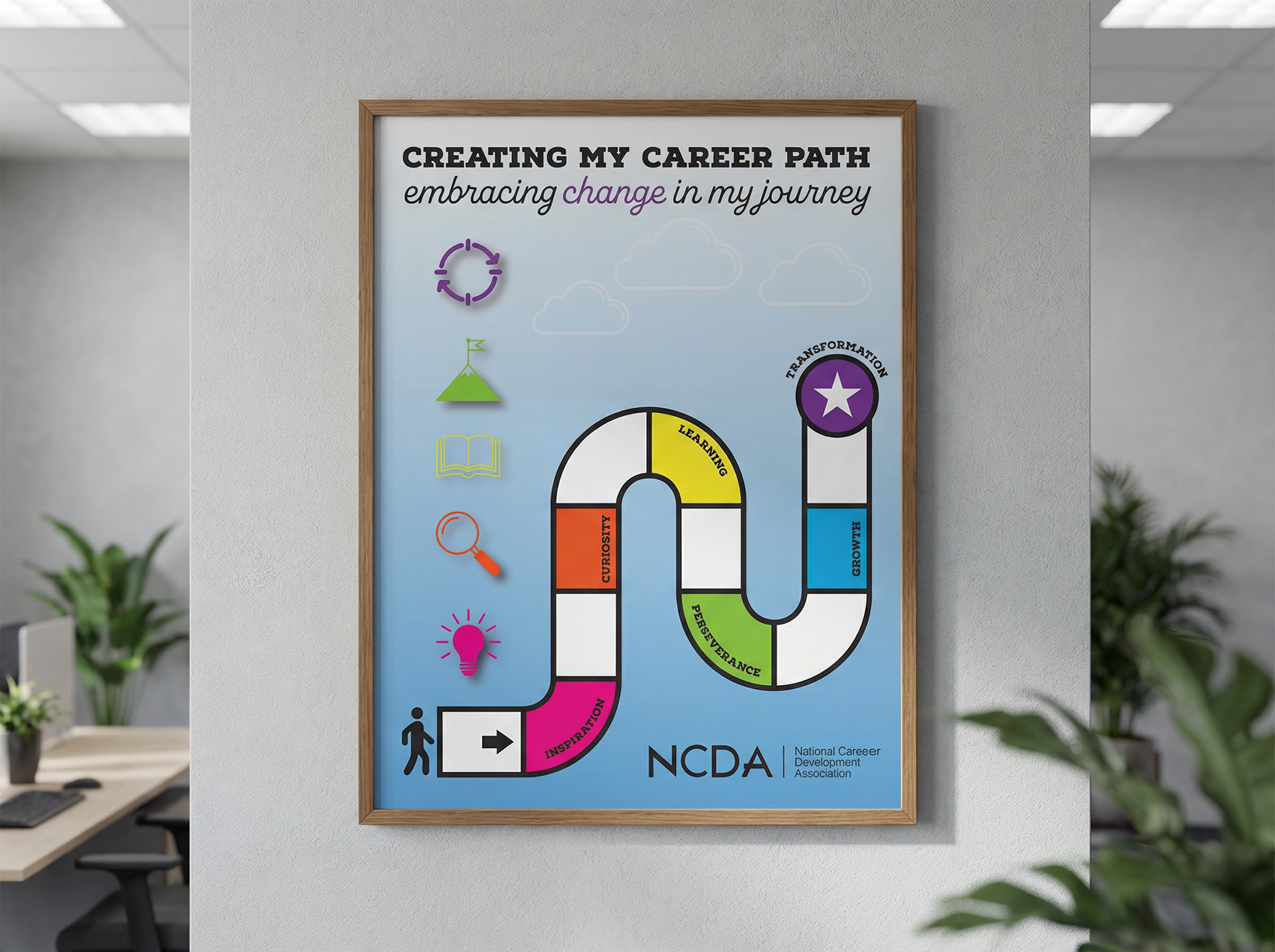 A poster design exploring career growth as a flexible, evolving journey rather than a straight line. Using simple icons, bold color sections, and a clear visual path, the design reflects learning, curiosity, perseverance, and personal growth. Created to feel approachable and encouraging, with a focus on clarity and visual storytelling.