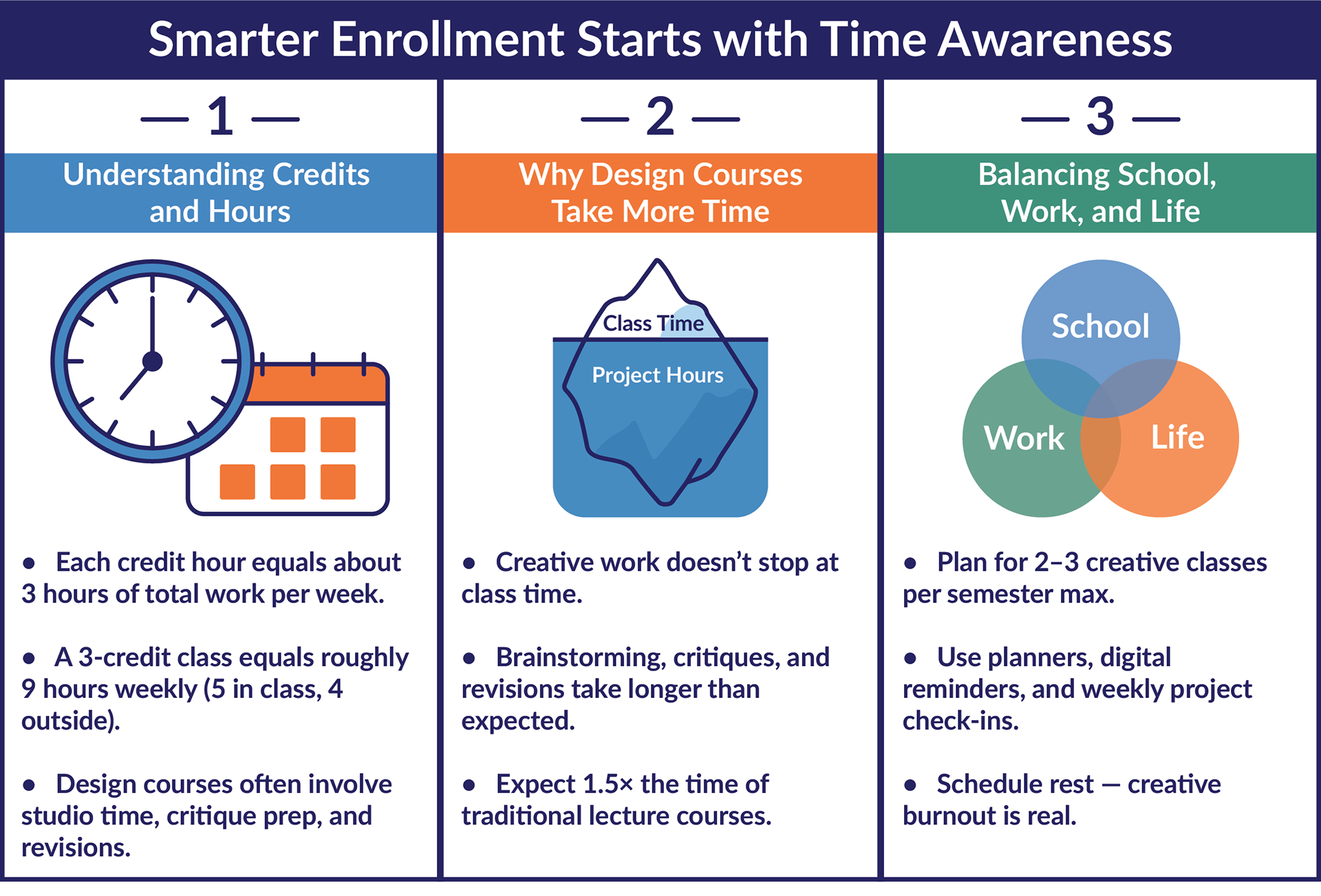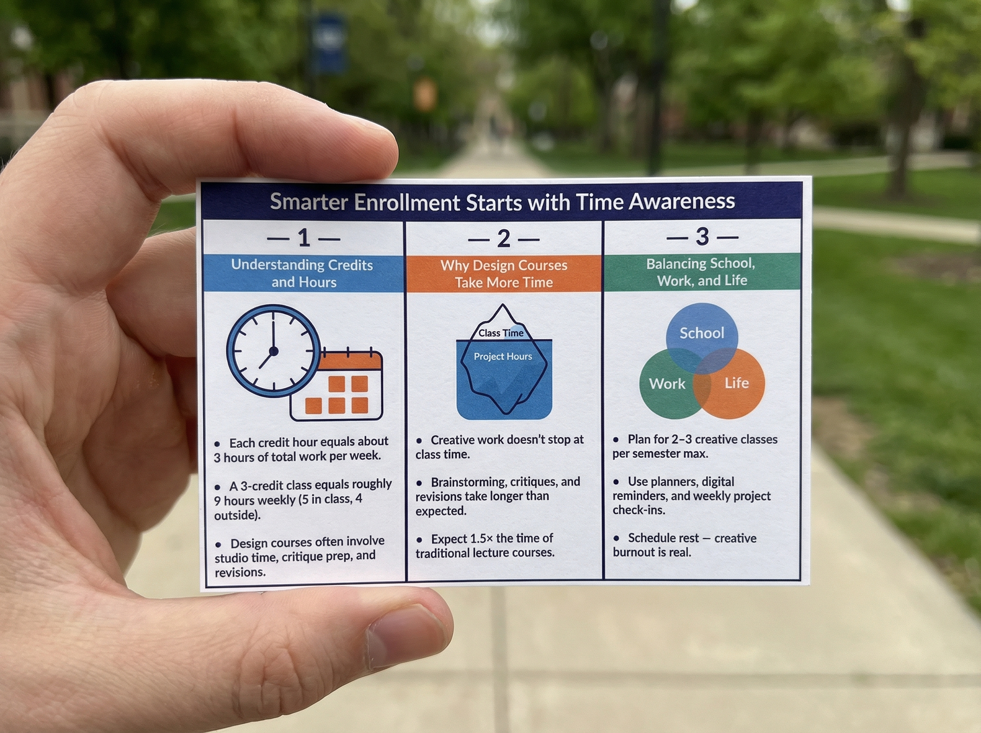 An informational graphic designed to help students better understand the time commitment behind design coursework. The layout breaks down credits, project hours, and life balance using simple visuals and clear hierarchy. The goal was to make planning feel approachable while setting realistic expectations for creative workloads.