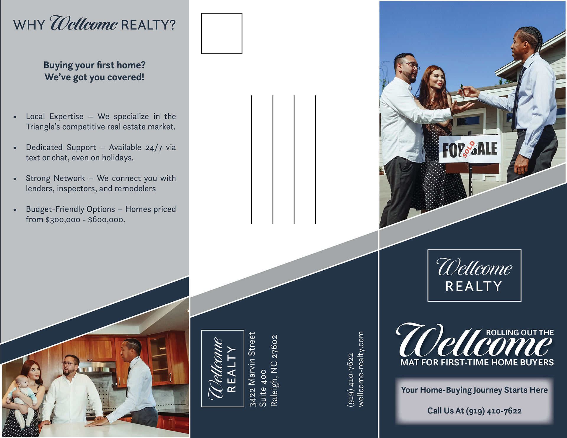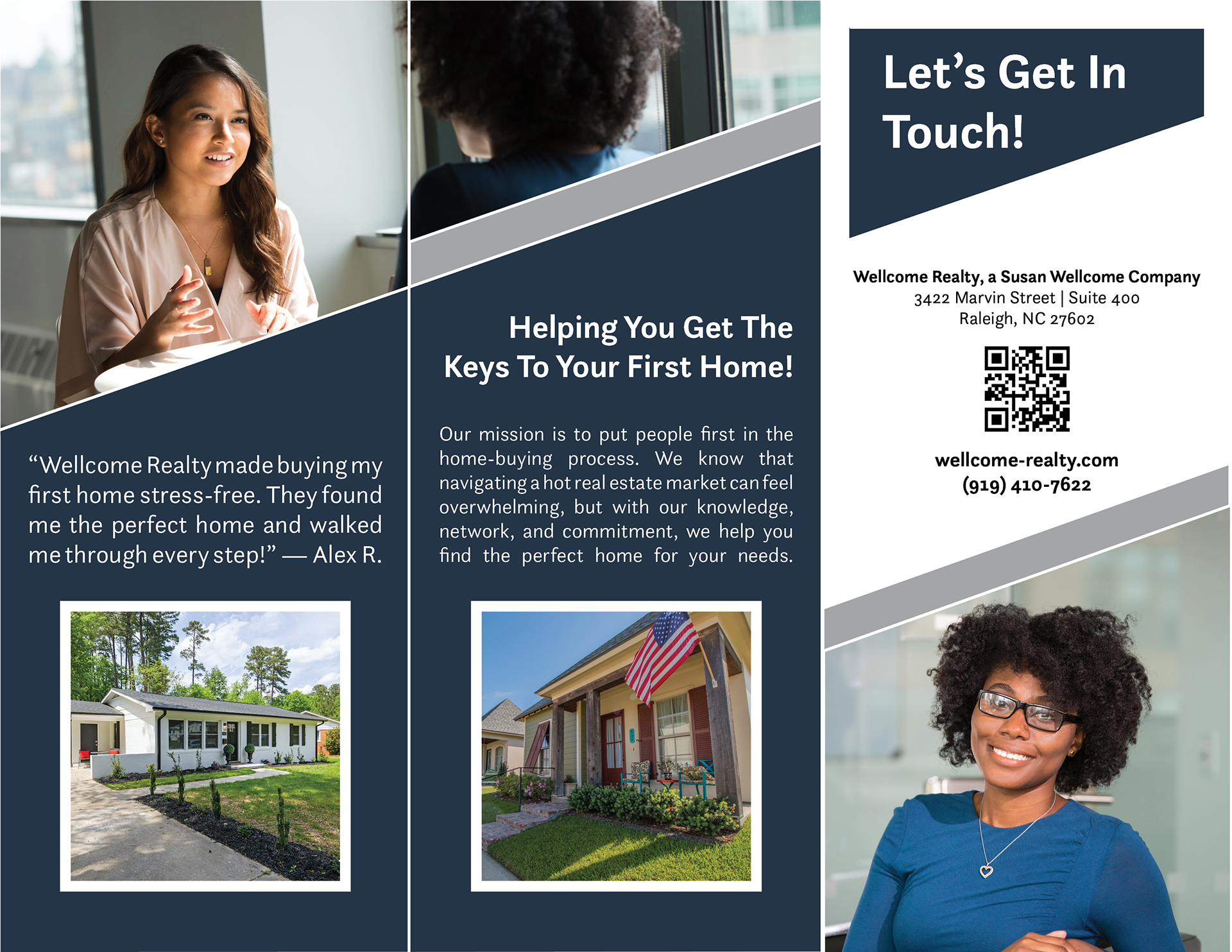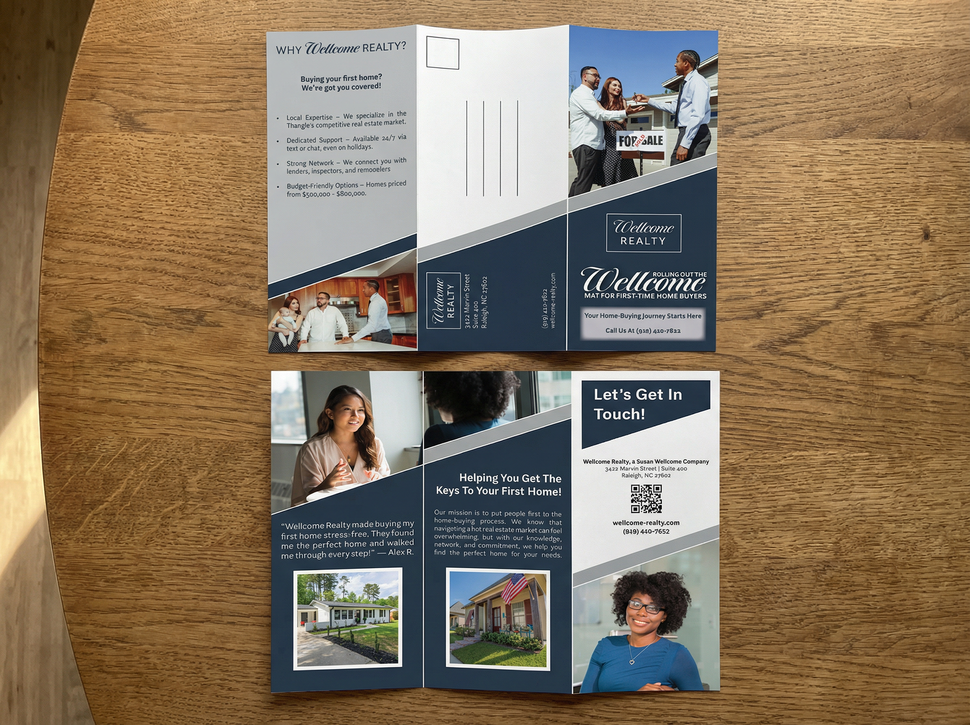 A tri-fold brochure created to introduce first-time home buyers to Wellcome Realty in a clear, approachable way. The design focuses on trust, simplicity, and local expertise, using clean typography, structured layouts, and real-life imagery to guide readers through the buying process. The goal was to feel professional without being intimidating, making the experience approachable from first glance to final contact.